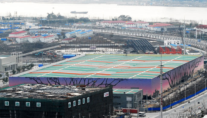 位于上海世博會浦東園區的世博標志建筑“一軸四館”全景。