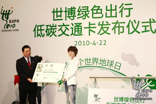 世博網4月22日消息:今天是第41個世界地球日,全球首款低碳交通卡——“世博綠色出行低碳交通卡”在上海正式發布。發布儀式上,著名影星孫儷第一個購買了世博綠色出行低碳交通卡,并宣讀了世博綠色出行倡議書。