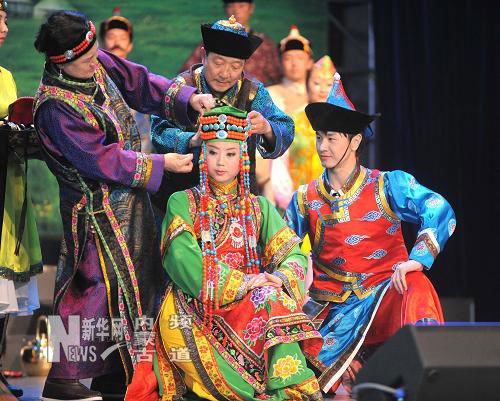 記者:我現在正在位于世博園B區的寶鋼大舞臺,內蒙古的科爾沁婚禮婚俗表演剛剛結束,悠揚的馬頭琴聲,神秘的呼麥(編者注:“呼麥”是圖瓦文xoomei的中文音譯,原義指“喉嚨”,即為“喉音”,一種藉由喉嚨緊縮而唱出“雙聲”的泛音詠唱技法。呼麥又稱“蒙古喉音”。呼麥作為一種歌詠方法,目前主要流傳于中國內蒙古),蒙古舞讓我對蒙古心馳神往,內蒙古科爾沁婚禮的婚俗表演是通過歌舞的形式讓我們了解蒙古族的婚俗,蒙古婚禮跟漢族婚禮有一點是一樣的,新郎要去新娘家接新娘回來,在這個過程中蒙古新郎不像漢族新郎那么幸運,必須接受一次次的考驗,比如射箭,因為是游牧民族,而且為了考驗新郎的力氣必須掰羊脖,這個過程當中,陪娘們(類似于漢族的伴娘)有一些為了戲弄新郎,找一根紅柳棍或者是一根鐵棍子插進羊脖子的骨髓道里,如果新郎事先有指點他當然會識破其中的奧妙取出這個棍子,很容易將羊脖子掰斷,有的新郎不知道秘密,就會非常狼狽。