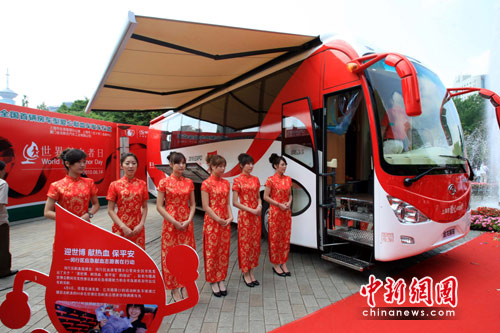 6月2日,中國內(nèi)地首輛房車型愛心獻(xiàn)血車在上海發(fā)車啟用,并將駛?cè)胧啦﹫@區(qū),開展愛心獻(xiàn)血活動(dòng)。該獻(xiàn)血房車價(jià)值500萬元,車內(nèi)寬敞,空氣清新,可營造“快樂獻(xiàn)血”氛圍。中新社發(fā) 潘索菲 攝