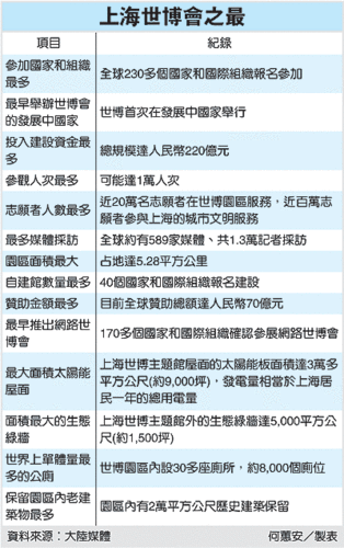 文章提到,上海世博會不僅場館之多創下世界紀錄,展地橫跨黃浦江兩岸達5.28平方公里,也是歷年最大面積的世博會;觀展人數最多,預計超過7千萬人次;它更是第一次由開發中國家主辦,是中國人花幾代人努力下才有的世界重量級活動。