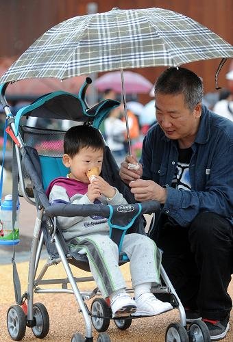 5月14日,一位游客在上海世博園內為孩子遮雨。當日,上海市的降雨天氣并沒有影響游客游覽的興致,雨中洋溢著的濃濃溫情讓人感動。(新華社記者 徐家軍/攝)