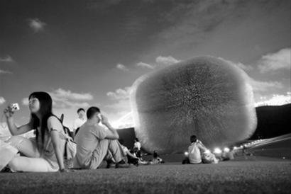 這兩天氣溫適宜,游客在展館前的草坪上愜意休息