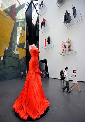 在意大利館的廣場上,杜嘉班納、范思哲、普拉達(dá)、杰尼亞設(shè)計(jì)的奢侈品服裝最招女人青睞,4個(gè)3.5米高的大型服裝模特與12個(gè)裝點(diǎn)墻壁上的常規(guī)模特前往往站滿了人,范思哲剪裁獨(dú)具匠心的紅裙往往吸引最多女人的目光。