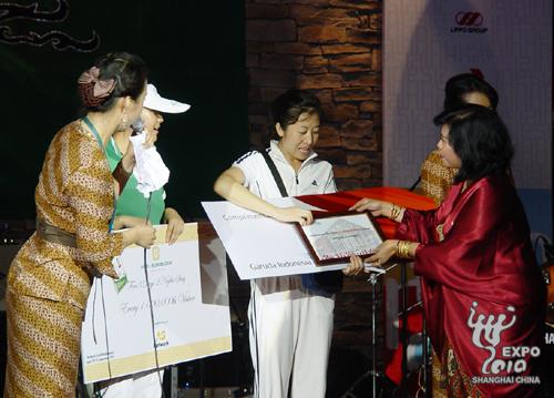 8月16日,印度尼西亞館迎來(lái)了第500萬(wàn)名游客——一對(duì)來(lái)自河北的母女,母親叫張鳳英,女兒叫宋佳琦。她們也受邀參加了今天的國(guó)慶日活動(dòng),并獲贈(zèng)2人“6天4夜往返上海-雅加達(dá)-巴厘”旅游大獎(jiǎng)。此外,印度尼西亞館還特別給5018745位游客頒發(fā)了大禮包,187代表8月17日國(guó)慶日,45代表印尼于1945年建國(guó)。