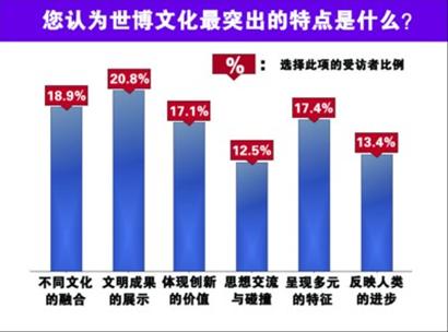 本次調(diào)查中,20.8%的受訪者認(rèn)為,上海世博會的文化特點(diǎn)是人類文明成果的集中展示;其次是不同區(qū)域、種族文化的融合;而呈現(xiàn)在參觀者面前的,確確實(shí)實(shí)是文化的多元化特征。