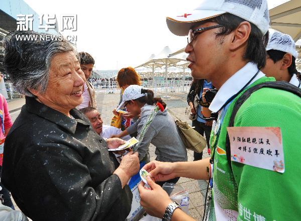 10月16日,志愿者在世博園為一位來自寧波85歲的戴桂芳老人送上鮮花和紀(jì)念徽章。新華社記者 張國俊 攝