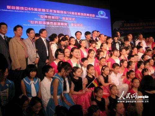 為促進低碳節能,共建和諧世界,推動世界的和平與發展,同時用文化交流宣傳和諧世界理念,以獨特的主題節目形態弘揚中華文化,謳歌世界和平與發展的大趨勢,展示中國敞開胸懷與世界相融合的新境界,頌揚聯合國60年來為世界和平與發展所作出的巨大貢獻及取得的偉大成就,紀念活動辦得豐富多彩,生動活潑、雅俗共賞。全天的紀念活動共分四大版塊。一是舉辦了“首屆世界和諧城市論壇”,來自聯合國、中國各地的官員和專家就如何加強和諧世界建設進行了熱烈討論;二是舉行了“世界低碳日”發起儀式,第一次由我國民間組織向聯合國提出設立“世界低碳日”;三是舉行了“世界和諧城市標準草案”提交儀式,由世界和諧基金會主席劉藩將我國學者起草的“世界和諧城市標準草案”提交給了聯合國人居署官員,中國幸福研究院院長徐景安就《世界和諧城市標準》 草案作了說明;四是舉行了盛大的文藝演出,《夢想之旅》藝術團的部分演員和靜安區青少年活動中心的《新蕾合唱團》的小朋友跳起了《低碳之舞》,著名歌唱家胡曉晴演唱了《和諧之歌》,曾得到奧斯卡音樂獎提名的尤雁子演唱了《地球,美麗家園》,中國乃至世界上小有名氣的邁克爾.杰克遜的模仿秀演員邁克爾.王杰進行了表演,“田震”也到現場助陣。會上,全體人員唱起了生日歌,祝福聯合國65華誕、祝福聯合國千年發展目標10周年。會上還播放了聯合國秘書長潘基文題詞的照片,并給以純集團等頒發了“世界優秀和諧企業”,郭東林等頒發了“世界友好和諧使者”。整個活動在《和諧世界》全場互動的歌聲中圓滿結束。