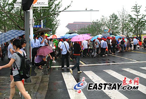 6號(hào)門(mén)入口外的志愿者服務(wù)站站長(zhǎng)汪愛(ài)華則從專(zhuān)業(yè)服務(wù)人員的角度為記者分析了入園人數(shù)爆棚的現(xiàn)象,她認(rèn)為上海居民手中世博大禮包6月票的時(shí)限將近、外地游客報(bào)旅行社早已定好時(shí)間以及海外游人數(shù)量的增加是主要客觀原因,而人們不約而同地認(rèn)為“雨天人少我們快去”則是出于主觀。“大雨澆不滅游人的熱情,只是大家湊巧想到了一起而已。”