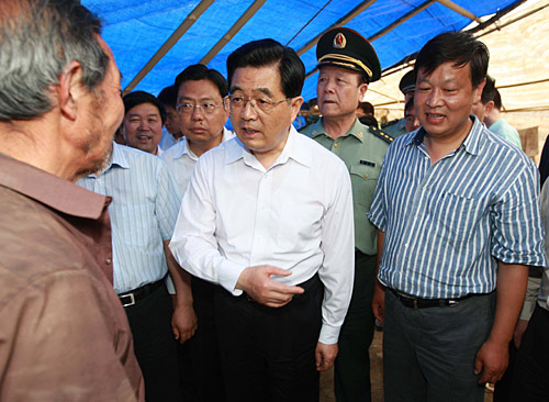 5月31日,中共中央總書記、國家主席、中央軍委主席胡錦濤前往陜西地震重災區漢中市,察看災情,指導抗震救災工作。這是胡錦濤在寧強縣廣坪鎮金山寺村同受災群眾親切交談。 新華社記者鞠鵬攝