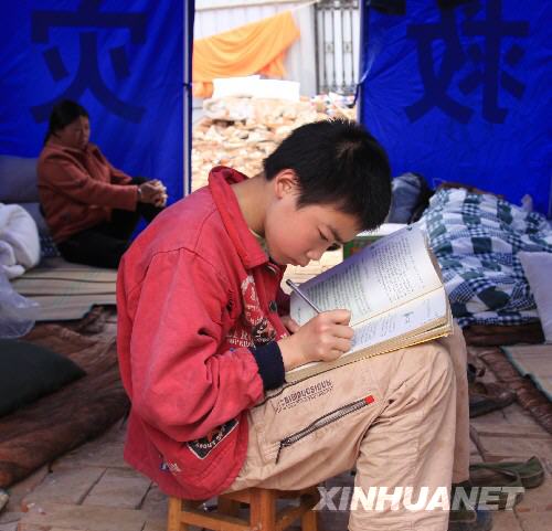 5月22日,在安縣永安鎮安置點的帳篷里,14歲的馬啟林正在看書。