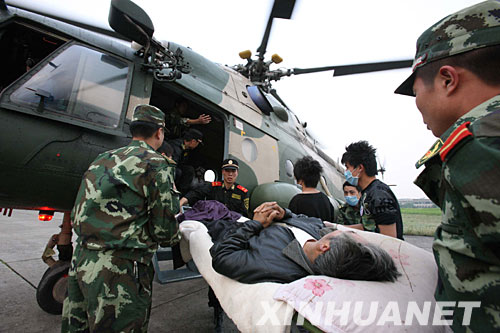 5月21日,直升機降落在成都鳳凰山機場,武警官兵將傷員抬出。新華社記者 王建民攝