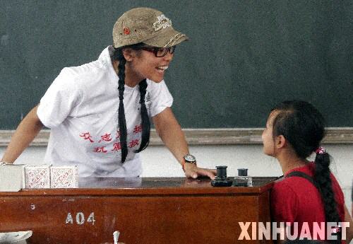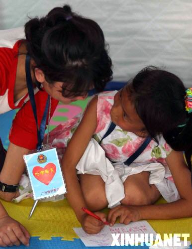 5月26日,心理咨詢師黃慧敏(左)與一名災區孩子交流。 當日,在四川綿陽安縣黃土災民安置點帳篷小學,心理咨詢師黃慧敏為孩子們上了一節團體心理輔導課。此次團體心理輔導針對年齡在8到13歲之間、在地震災害中心理傷害較輕的孩子,他們的父母都健在。 新華社發(劉洪群 攝)
