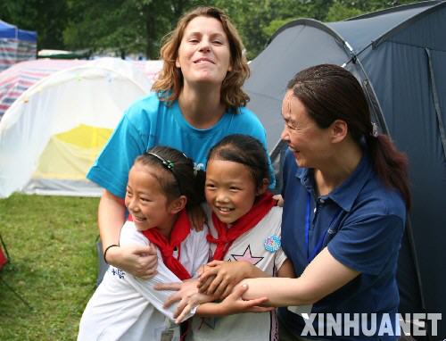 5月27日,聯合國兒童基金會等機構的工作人員在西南財經大學的校園內與來自震區的孩子們做游戲。 近日,聯合國兒童基金會、國務院婦女兒童工作委員會辦公室和民政部等機構,聯合在四川震區進行兒童心理重建工作,幫助孩子們撫平心理創傷。 新華社記者黃堃攝