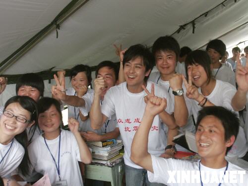 5月26日,演員林志穎(中)來到地震重災區四川省什邡市什邡中學的帳篷教室看望復課學生,為學生們鼓勁。 當日,濮存昕、林志穎、韋唯等一批明星義工前往四川省什邡市什邡中學看望復課學生,給孩子們進行心理輔導。 新華社發(張曉理 攝)