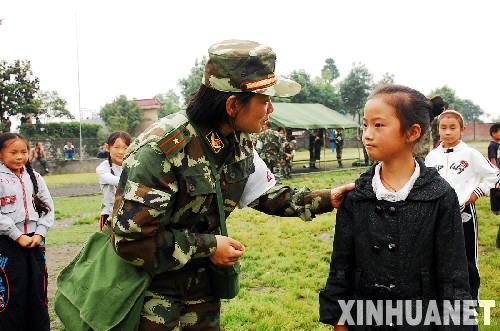 5月25日,在四川省都江堰市紫坪埔鎮都江村,一位醫療隊員(前左)在災后心理危機干預課上與孩子交流。 當日,由福建省公安邊防總隊赴川抗震救災醫療隊創辦的“福建邊防學校”在都江堰市紫坪埔鎮都江村正式開學,來自紫坪埔災區的83名孩子重新回到課堂。醫療隊挑選出一批官兵擔任教師,并在教學內容中增設抗震知識、心理疏導、軍事常識等特色課程。 新華社發