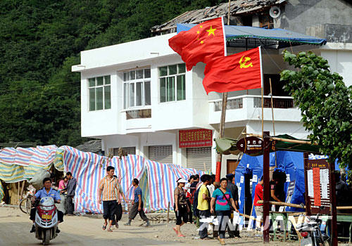 青川是大地震中受災最嚴重的地區之一。地震發生后,青川縣專門購置了7500多面國旗,下發到每個安置點和每家每戶。到處飄揚的五星紅旗極大鼓舞了人們抗震救災的士氣。 新華社記者 楊金志 攝
