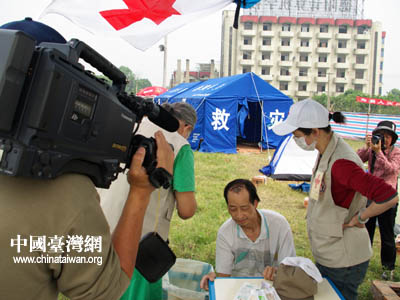 20日下午,臺灣紅十字組織醫療隊帶約3噸醫療用品等物資前往廣漢市,21日在高坪鎮,23日在體育場救災點設立醫療救護站,展開救護服務。救護站設有中、西醫。從21日至24日共計診治476名。對數十名老弱災民進行體檢,做了一臺氣胸手術、兩個骨折手術。和一個頭皮縫合小手術。內、外科,兒科,針灸,急處方發藥點。巴蜀音像制作中心 蘭志泉 攝