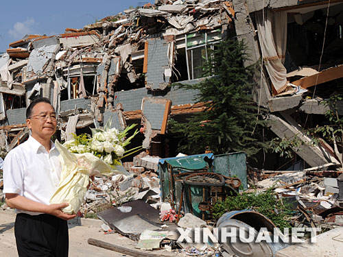 9月1日,溫家寶徒步一個小時,進入地震中慘遭滅頂之災的北川縣城,在遇難者集體掩埋處向遇難者獻花。新華社記者 黃敬文攝