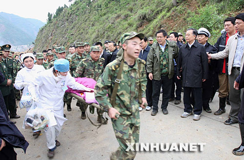 資料圖片:5月14日,國務院總理溫家寶抵達地震重災區四川北川縣察看災情。這是溫家寶在距北川縣縣城僅兩公里的曲山鎮察看災情時,幾名戰士抬著小女孩宋馨懿從縣城方向跑過來,溫家寶和隨行人員趕緊讓路。溫家寶說,時間就是生命,要盡全力救人。 新華社記者姚大偉攝