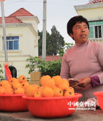 白玉村民在路邊向游客銷售枇杷。她家里有100多棵枇杷樹(shù),今年收成不錯(cuò),收入可以有2—3萬(wàn)元。 (中國(guó)臺(tái)灣網(wǎng) 田云鵬 攝)