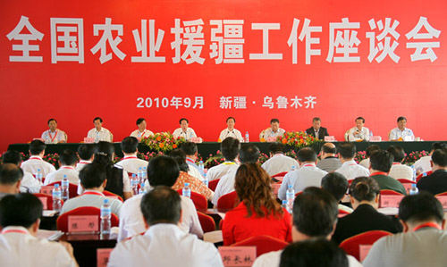 韓長賦要求,“十二五”時期,農(nóng)業(yè)援疆工作要重點抓好以下幾個方面:一要大力加強(qiáng)農(nóng)業(yè)基礎(chǔ)設(shè)施建設(shè)。加大新疆中低產(chǎn)田和鹽堿化耕地改造力度,加強(qiáng)優(yōu)質(zhì)糧食生產(chǎn)基地建設(shè)。完善農(nóng)田水利設(shè)施,啟動實施保護(hù)性耕作工程建設(shè),加快推進(jìn)農(nóng)牧業(yè)裝備現(xiàn)代化,加快實施游牧民定居工程。二要做大做強(qiáng)特色農(nóng)牧業(yè)。大力推進(jìn)特色農(nóng)牧產(chǎn)品生產(chǎn)基地和產(chǎn)業(yè)帶建設(shè),推進(jìn)國家優(yōu)質(zhì)商品棉基地和現(xiàn)代優(yōu)質(zhì)畜產(chǎn)品、水產(chǎn)品基地和養(yǎng)殖小區(qū)建設(shè),加強(qiáng)特色林果良種繁育建設(shè)和標(biāo)準(zhǔn)化創(chuàng)建,積極支持新疆發(fā)展休閑農(nóng)業(yè)和鄉(xiāng)村特色旅游。發(fā)揮兵團(tuán)優(yōu)勢,加快培育壯大特色優(yōu)勢產(chǎn)業(yè)集群。三要大力發(fā)展產(chǎn)業(yè)化經(jīng)營。支持糧油、林果、番茄、啤酒花、肉類、乳制品等特色農(nóng)牧產(chǎn)品精深加工。推動鄉(xiāng)鎮(zhèn)企業(yè)創(chuàng)新體制機(jī)制,加快技術(shù)改造。積極幫助引進(jìn)龍頭企業(yè)入戶新疆,加快形成特色產(chǎn)業(yè)帶或產(chǎn)業(yè)群。四要加快建立農(nóng)牧業(yè)科技創(chuàng)新和服務(wù)體系,重點在加強(qiáng)基礎(chǔ)設(shè)施、改善辦公條件、強(qiáng)化人員培訓(xùn)、完善服務(wù)功能等方面給予大力支持。深入開展測土配方施肥,引進(jìn)、示范和推廣節(jié)水灌溉、高產(chǎn)栽培、疫病防控、規(guī)模養(yǎng)殖等先進(jìn)適用技術(shù)。繼續(xù)做好援疆干部和“博士服務(wù)團(tuán)”成員選派工作。五要著力加強(qiáng)農(nóng)牧民教育培訓(xùn)工作。繼續(xù)實施好陽光工程,大力開展實用就業(yè)技能培訓(xùn),推進(jìn)農(nóng)村勞動力轉(zhuǎn)移就業(yè)。進(jìn)一步完善農(nóng)牧業(yè)遠(yuǎn)程教育網(wǎng)絡(luò),支持開展少數(shù)民族文字和音像教材翻譯等工作。六要切實加大生態(tài)保護(hù)與建設(shè)力度。進(jìn)一步加大退牧還草等工程實施力度,大力加強(qiáng)草原建設(shè)與保護(hù),積極探索建立草原生態(tài)補(bǔ)償機(jī)制。切實加強(qiáng)水生生物資源養(yǎng)護(hù)規(guī)范化、制度化建設(shè)。繼續(xù)大力支持農(nóng)村沼氣工程建設(shè)。七要進(jìn)一步擴(kuò)大農(nóng)業(yè)對內(nèi)對外開放。加快實施新疆農(nóng)業(yè)“走出去”戰(zhàn)略。支持東中部企業(yè)參與新疆特色農(nóng)牧產(chǎn)品生產(chǎn)和開發(fā)。鼓勵新疆農(nóng)牧企業(yè)參加各類博覽會、展銷會等。
