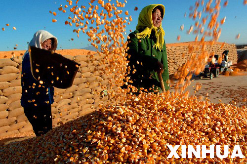 這是在寧夏紅寺堡一處糧食收購點,兩位婦女正在堆放玉米(2006年11月10日攝)。2006年秋季,寧夏引黃灌區玉米、小麥、水稻三大作物喜獲豐收。新華社發
