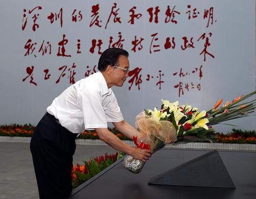 8月21日,溫家寶專程來到深圳博物館參觀《改革開放總設計師鄧小平》大型展覽。這是溫家寶參觀展覽前向鄧小平同志塑像獻花。