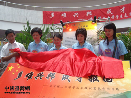 座談會后,幾位代表為北京理工大學抗震救災圖片展揭幕(攝影:鐘寶華)