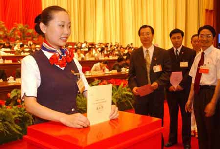 7月24日,來自中國東方航空西北公司的“全國青年文明號”乘務(wù)長朱喆在北京人民大會堂舉行的中國共產(chǎn)主義青年團(tuán)第十五次全國代表大會第二次全體大會上投票。當(dāng)日,出席共青團(tuán)十五大的1500多名青年代表以無記名投票方式選舉產(chǎn)生了中國共產(chǎn)主義青年團(tuán)第十五屆中央委員會。新華社記者袁滿攝