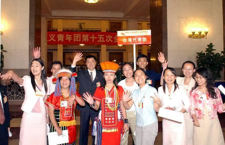 03年7月22日,中國共產主義青年團第十五次全國代表大會在北京人民大會堂舉行。這是臺灣代表團代表在開幕會后高興地在人民大會堂合影留念。