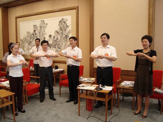 小組會上,團十六大開幕式獻詞少先隊員之一劉丹陽所在學校的教師-來自宜昌市特殊教育學校的教師嚴娜在發言后,現場教授各位代表做“中國加油”、“我們永遠在一起”、“我愛共青團”等手語。