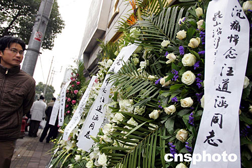 上海龍華殯儀館大廳今天莊嚴肅穆,大廳門楣上懸有黑色橫幅,上書:“為汪道涵先生送行”,兩邊的挽聯上寫著:申江水闊百年初現鴻圖愿,海峽月圓萬里同懷碩儒風。數百只潔白的花圈環繞于大廳內外,汪道涵先生遺體靜臥于靈臺上,白色和粉色的鮮花簇擁著他。