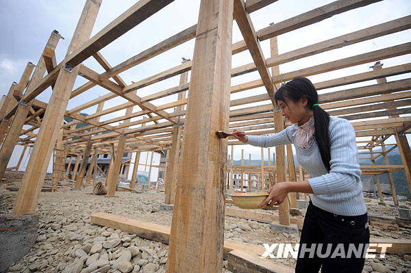 5月6日,青川縣板橋鄉(xiāng)浮寨村災后農房重建示范點,一位村民正在給房屋柱子上桐油。新華社記者 李曉果 攝