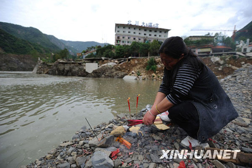 5月10日,在北川老縣城,一位母親在悼念孩子。