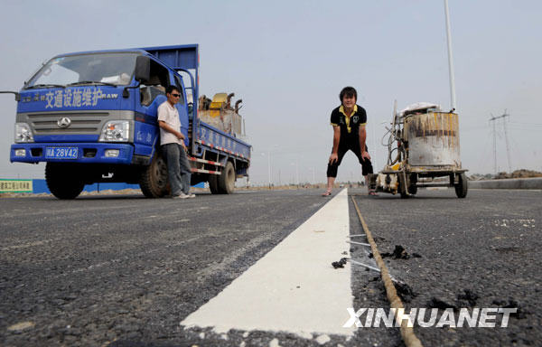 5月3日,工人在為綿竹市漢旺新鎮寬闊的馬路畫分道線。新華社記者陳燮攝