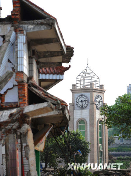 這是5月3日拍攝的綿竹市漢旺鎮廢墟和鐘樓。新華社記者陳燮攝