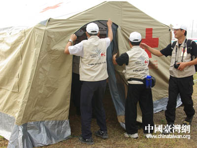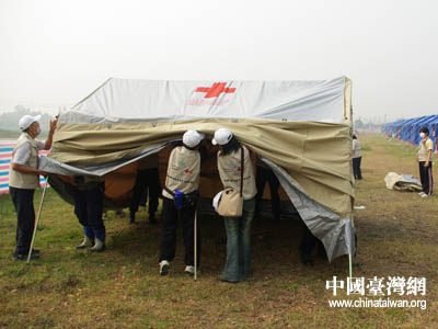 臺灣紅十字組織醫療隊在搭建醫療帳篷