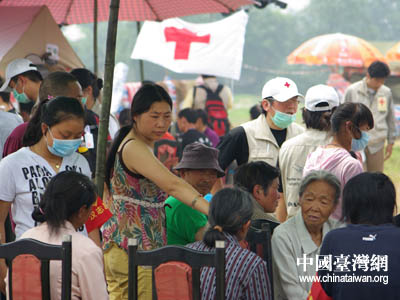 20日下午,臺灣紅十字組織醫療隊帶約3噸醫療用品等物資前往廣漢市,21日在高坪鎮,23日在體育場救災點設立醫療救護站,展開救護服務。救護站設有中、西醫。從21日至24日共計診治476名。對數十名老弱災民進行體檢,做了一臺氣胸手術、兩個骨折手術。和一個頭皮縫合小手術。內、外科,兒科,針灸,急處方發藥點。巴蜀音像制作中心 蘭志泉 攝