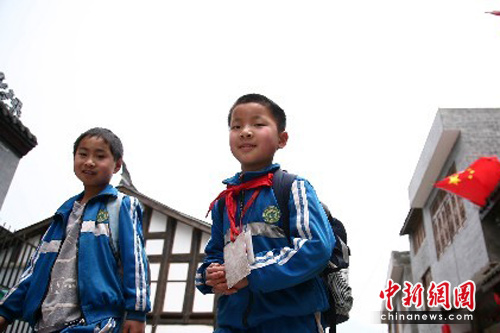 汶川八一小學學生放學后從紅旗招展的水磨鎮經過。