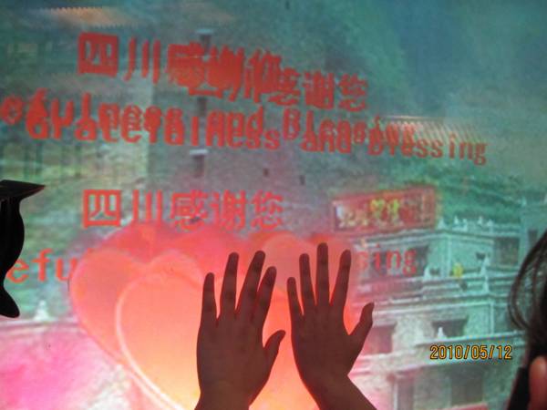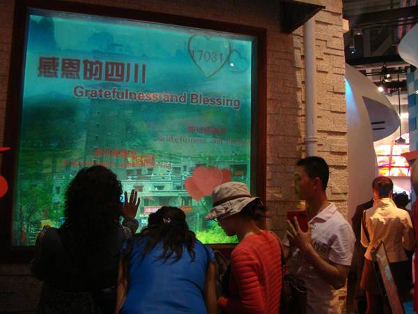 當天,世博會四川館的愛心墻大屏幕上不斷播放著汶川地震的場景以及重建美好家園的影音畫面。從各地趕來的游客也紛紛到此參觀,并駐足按下自己的愛心手印。截至當天下午15時許,愛心墻上共留下了17053個愛心手印。