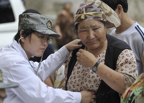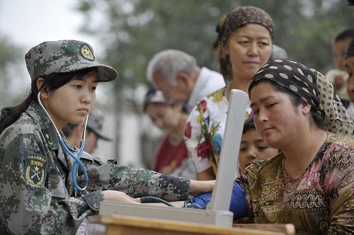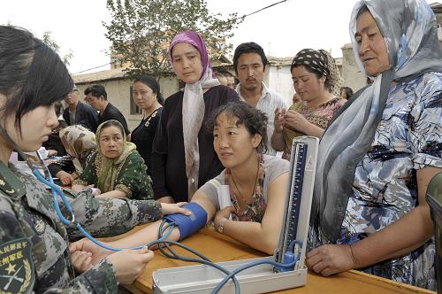 7月23日,解放軍第二十三醫(yī)院醫(yī)務(wù)人員為烏魯木齊八戶梁社區(qū)一位居民量血壓。當(dāng)日,解放軍第二十三醫(yī)院醫(yī)務(wù)人員來到烏魯木齊八戶梁社區(qū)開展義診活動,社區(qū)內(nèi)上百位各族居民前來問診,軍醫(yī)們還為當(dāng)?shù)刭浰土艘恍┏S盟幤贰P氯A社記者 趙戈 攝
