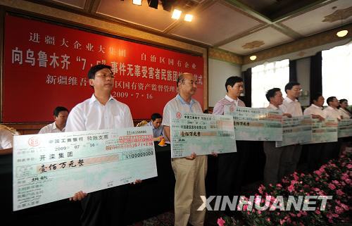 16日,神華集團、中糧集團、寶鋼集團等33家中央及外省(區、市)駐疆國有企業和中泰化學、中國移動新疆公司、新疆有色集團等33家自治區國有企業的代表齊聚烏魯木齊昆侖賓館,向“7·5”事件受害者和財產受損失的群眾捐款。其中,神華集團捐款5050萬元,中糧集團捐款2000萬元,寶鋼集團、中國保利集團、國家電網公司和國家開發投資公司等6家中央駐疆國有企業捐款在1000萬元以上。