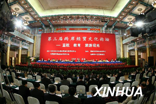 依據(jù)2005年4月29日中國共產(chǎn)黨中央委員會總書記胡錦濤與中國國民黨主席連戰(zhàn)會談新聞公報中關(guān)于“建立黨對黨定期溝通平臺”的共識,由中共中央臺灣工作辦公室海研中心與中國國民黨國政研究基金會共同主辦的第三屆兩岸經(jīng)貿(mào)文化論壇,于2007年4月28日至29日在北京舉行。本屆論壇之主題是“直航、教育、旅游觀光”。4月28日,中共中央總書記胡錦濤和中國國民黨榮譽主席連戰(zhàn)會見了出席論壇的海峽兩岸各界人士,并發(fā)表重要講話。連戰(zhàn)和中共中央政治局常委賈慶林出席論壇開幕式并先后發(fā)表演講。國共兩黨及親民黨、新黨、無黨團結(jié)聯(lián)盟人士和兩岸企業(yè)界人士、專家學者、臺商代表等共500余人出席了會議。