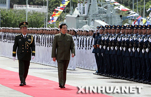 10時許,胡錦濤乘車抵達昂船洲海軍基地北碼頭。碼頭上,等待檢閱的官兵們身著新換發的軍裝,士氣高昂,軍容嚴整。在雄壯的閱兵曲中,胡錦濤走到軍旗前,向軍旗行注目禮,隨后檢閱了駐港部隊。胡錦濤對受閱官兵們表示親切問候,官兵們以響亮的回答感謝胡主席的關懷。