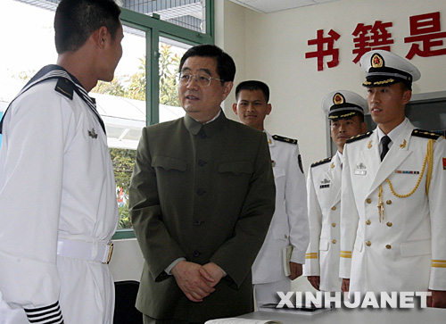 檢閱結束后,胡錦濤視察了艦艇大隊警通連閱覽室、電腦室,并走進連隊宿舍,同戰士們一一握手,圍坐在一起親切交談,仔細詢問大家的值勤、訓練、學習和生活情況。