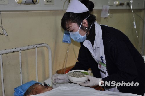 4月15日,青海玉樹地震中受傷的54名傷員分成兩批被送抵蘭州,蘭州大學第二醫院醫護人員為他們提供親情服務。衛生部門稱,還有后續傷員將擇時送抵。 中新社發 殷春永 攝