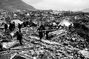 21日,玉樹結古鎮的災民們正在廢墟上收拾木料,為重建做準備。 記者 趙亢 攝