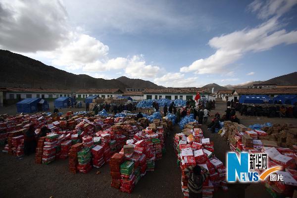 4月22日,牧民們將領到的救援物資分村擺放好。新華社記者費茂華攝