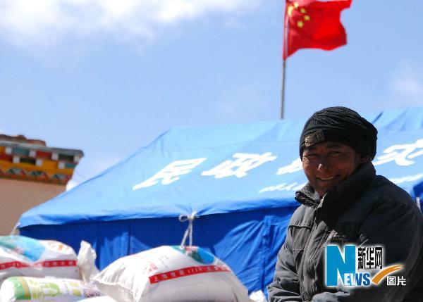 4月26日,一位玉樹縣隆寶鎮措桑村村民在救災帳篷前露出微笑。 新華社記者 文貽煒 攝